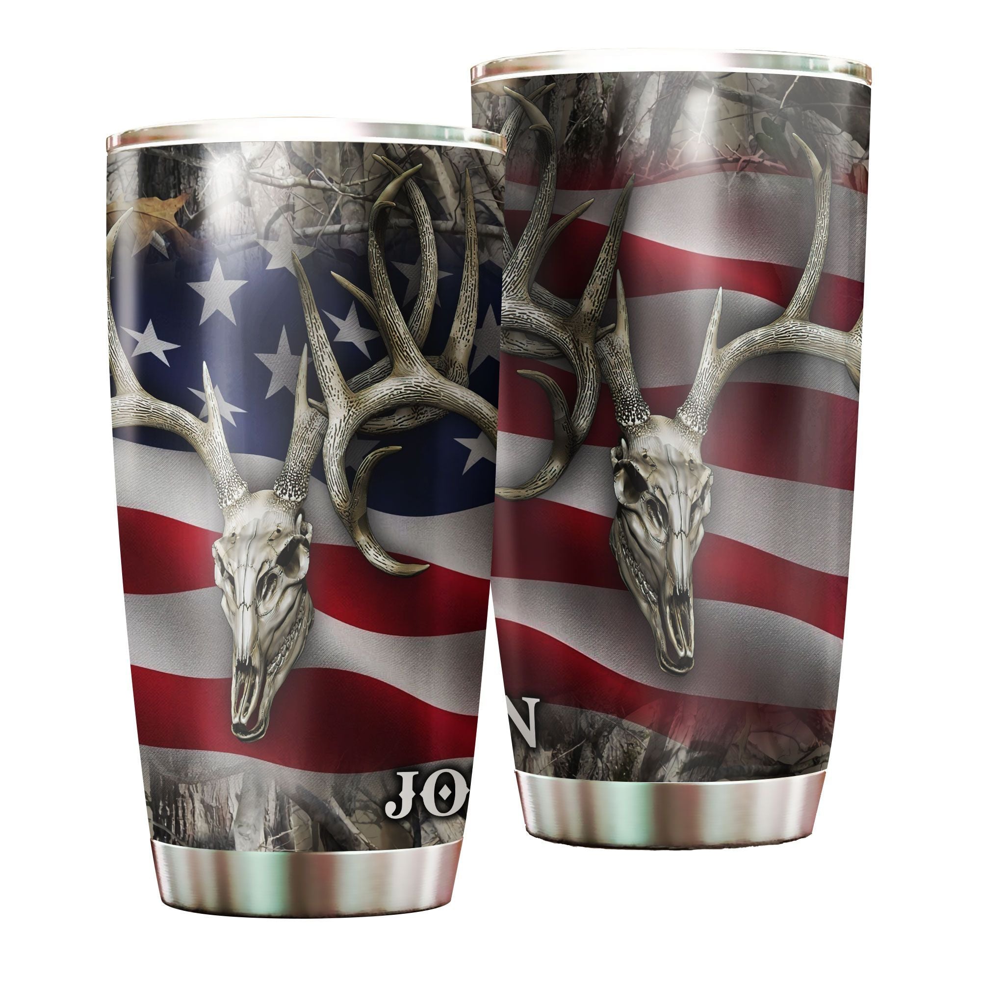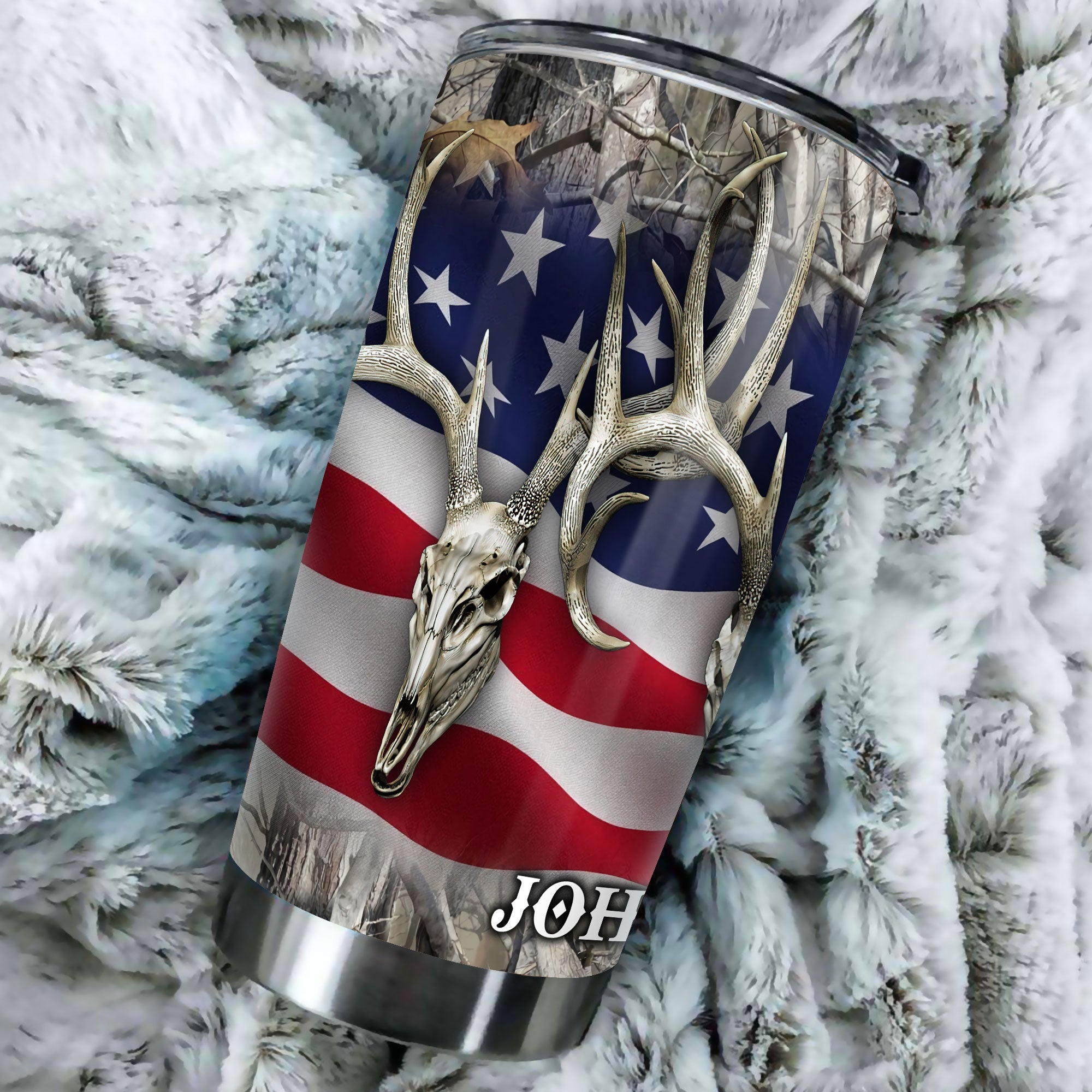 Personalized American Flag Deer Skull Hunting Stainless Steel Tumbler - Double-Walled Insulation Travel Thermal Cup With Lid Gift For 4th Of July Hunting Hunter