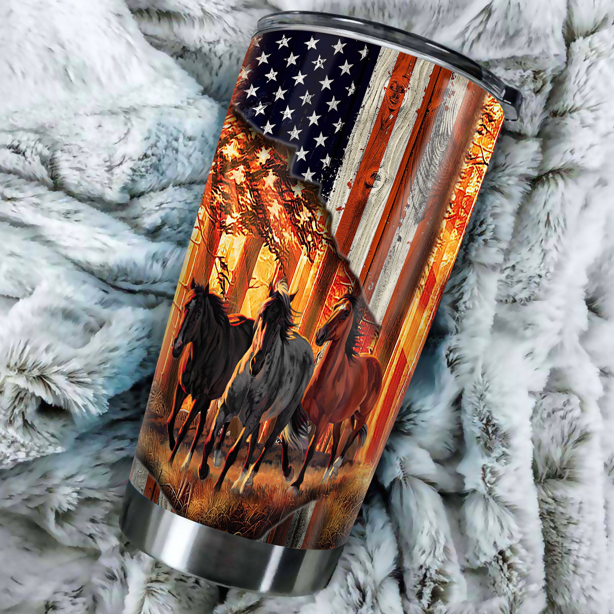 Camellia Personalized Horse American USA FLag Graphics Stainless Steel Tumbler - Double-Walled Insulation Travel Thermal Cup With Lid Gift For Horse Lover Barrel Racing