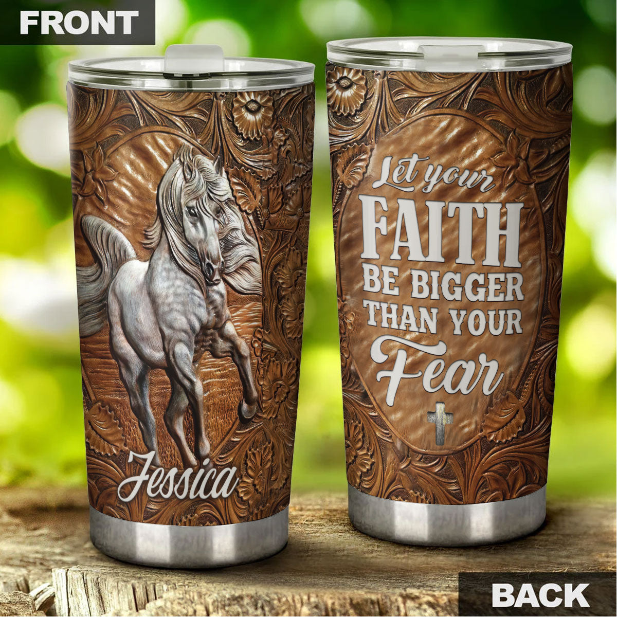 Camellia Personalized White Horse Let Faith Bigger Than Fear Wooden Stainless Steel Tumbler - Double-Walled Insulation Travel Thermal Cup With Lid Gift For Faith Believer